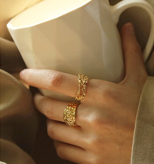 The EMES SHOP ring details a textured surface and an irregular patterned design. Features an open back and a trendy & unique design.