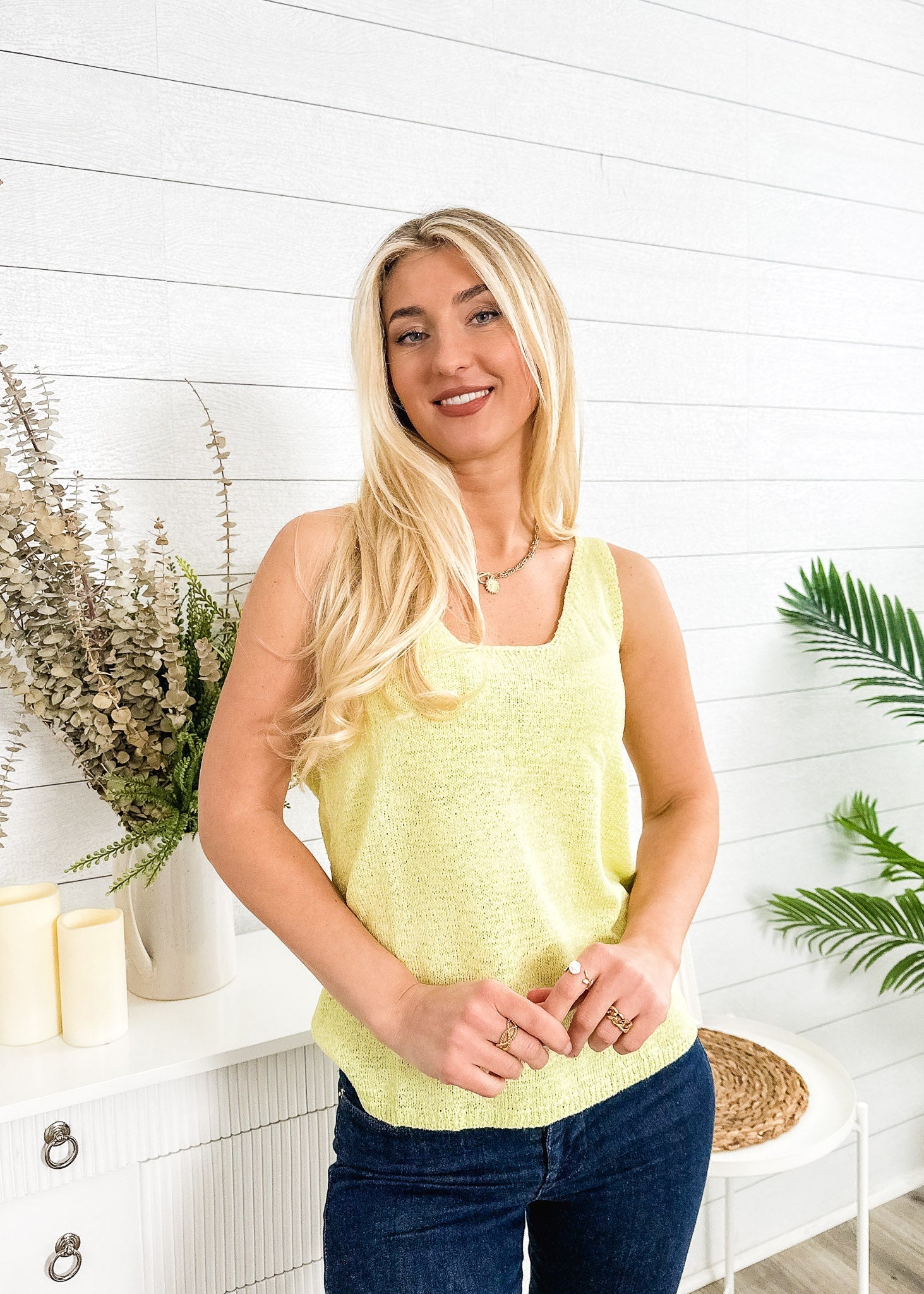 The EMES SHOP top is detailed with a gorgeous knit material. Features a scoop neck line. sleeveless. solid color. and regular fit. Pair it with denim shorts and sneakers for an easy summer look.