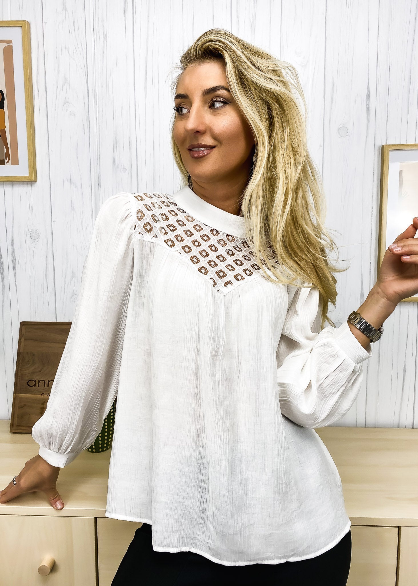 The EMES SHOP blouse is detailed with voluminous bishop sleeves. Features solid color. high neck line. lace detail. and flowy fit. Pair it with trousers and loafers for an elegant look.