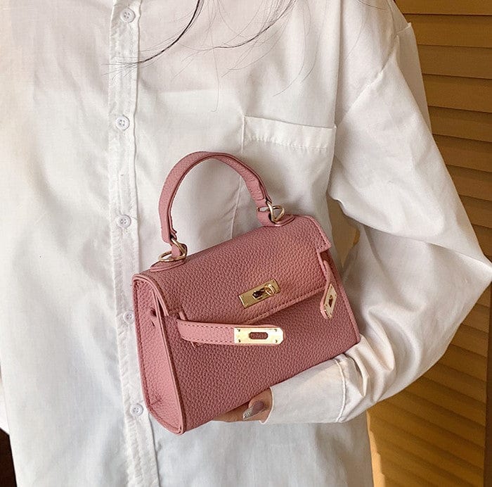 The Emes Shop bag details afaux leather feeland a luxurious design. Features a simple clasp. small handle. andcrossbodybag design.