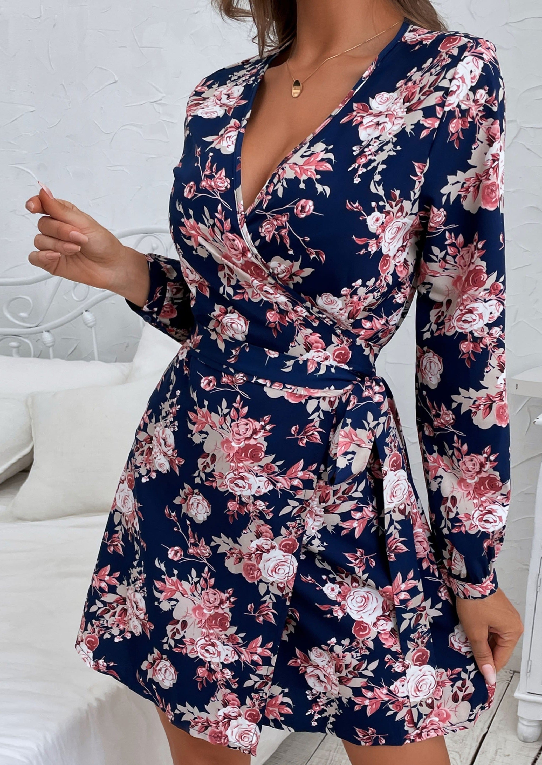 The Emes Shop dress is detailed with a sexy plunge surplice neck line. Features a floral print. long sleeves. tie waist. wrap style. and above knee length. Pair it with golden accessories and sandals for a cute look.