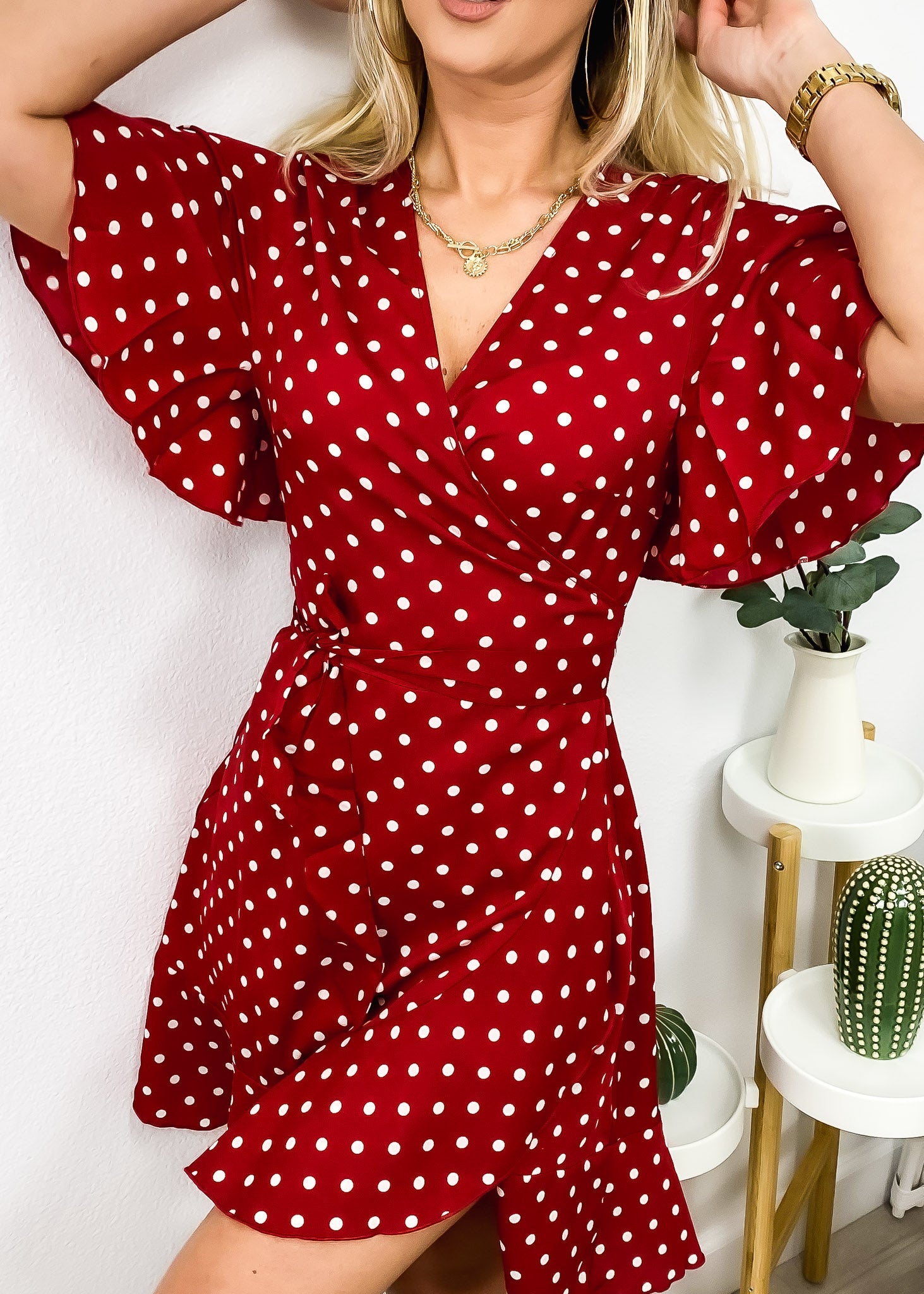 The Emes Shop dress is detailed with a classic polka dot print. Features a surplice neck line. flutter sleeves. wrap style. ruffle hem. and above knee length. Pair it with platform sandals and a handbag for a lovely look.