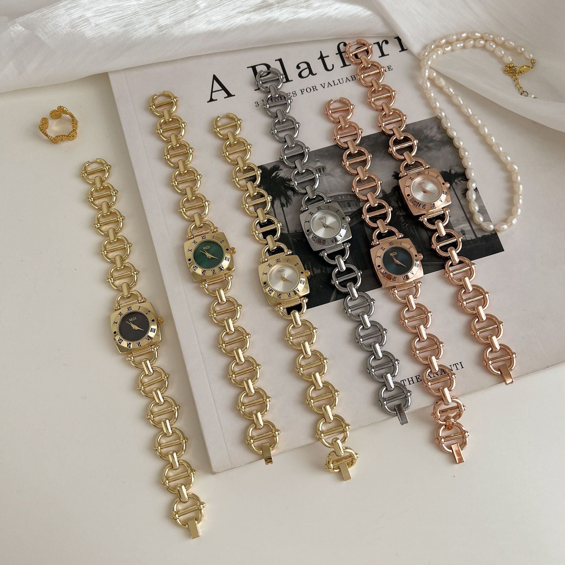 Color: gold strap white surface. gold strap green surface. gold strap black surface. rose gold white surface. rose gold black surface. silver stripe white surface