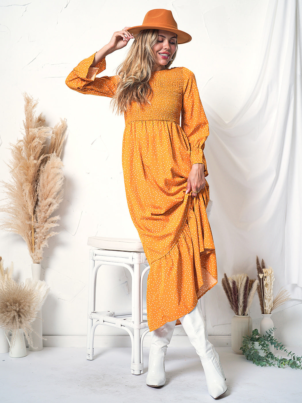 The EMES SHOP maxi dress is detailed with mini dots or a mixed pattern of floral prints across the entire dress. Features long ruffle sleeves. a smocked chest. round neckline. and ankle-length hem. A perfect casual or semi-formal dinner date dress with the right touch of chic contemporary style. Light and breathable for all day wear as well. Easily pair this dress with your favorite heels. a matching belt. and a clutch.