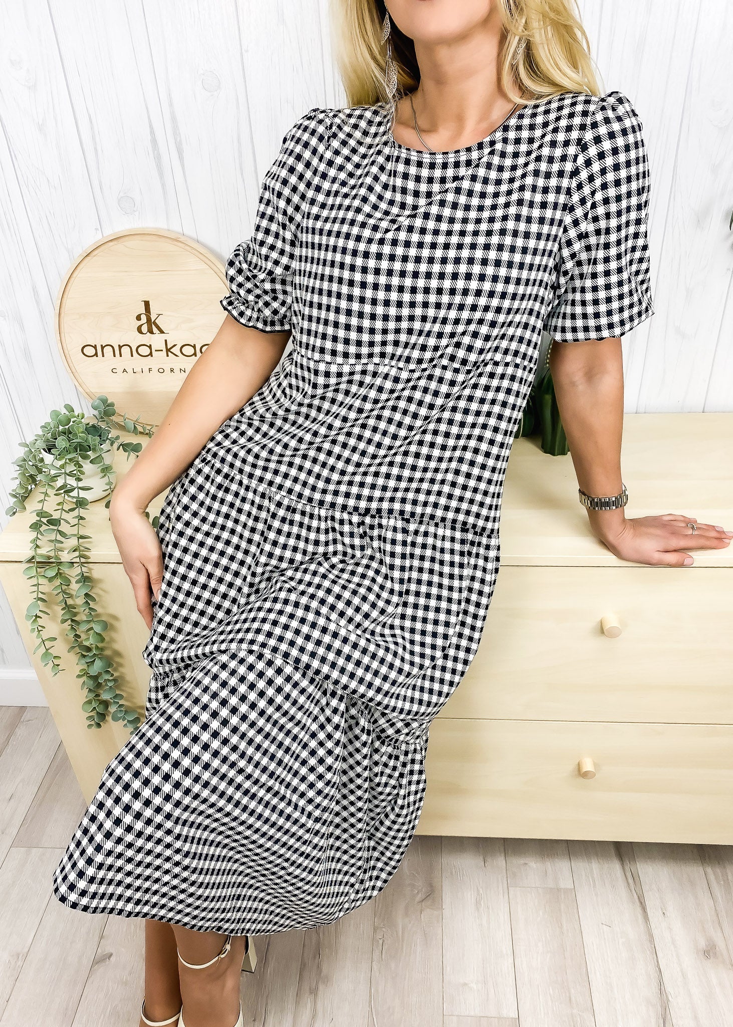 The EMES SHOP maxi dress is detailed with a unique plaid patterns. Features a round neckline. short sleeves. ankle length hem. and ruffle layered details from top to bottom. Made with 100% soft poly that's light and breathable for casual wear at home or outside on sunny days.Easily pair this dress with your favorite heels. a matching belt. and a summer clutch.