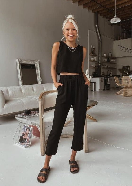 The EMES SHOP lounge set is detailed with a clean solid color. Features a round neck. sleeveless. cropped tank. and gartered cropped sweatpants. Pair it together with fuzzy slippers for a comfy at-home look.