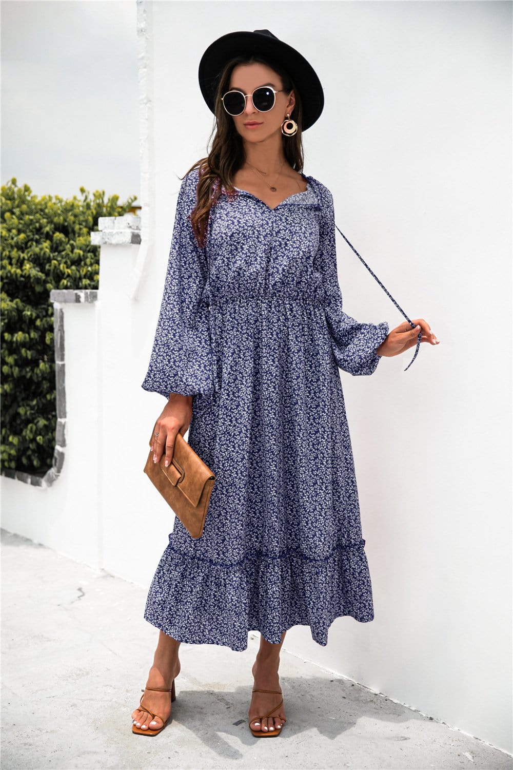 The EMES SHOP dress is detailed with a pretty ruffle hem. Features a tie neck detail. long sleeves. floral prints. gartered waist. and above ankle length. Pair it with a clutch bag and sandals for a chic summer look.