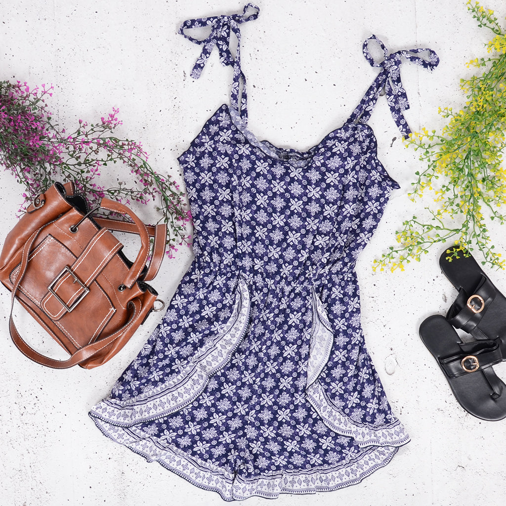 The EMES SHOP romper is detailed with a fun ribbon tie shoulder design that can be easily adjusted to your liking. Features a v neck line. ruffle details. floral print. and loose fit. Pair it with a straw hat and espadrilles for a fabulous look.