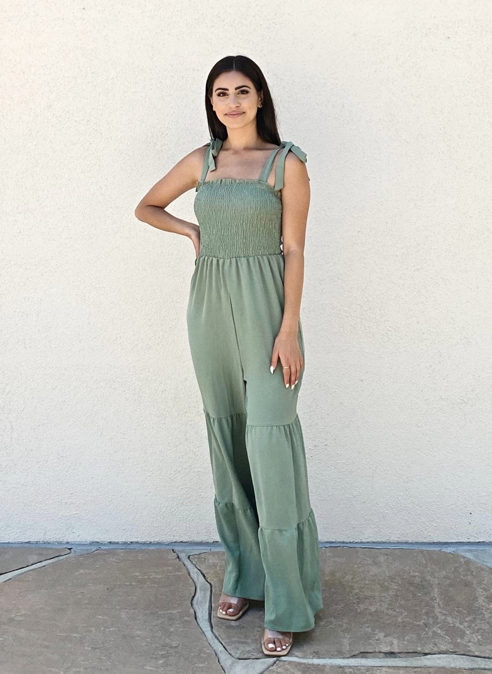 The EMES SHOP jumpsuit is detailed with unique tiered legs. Features a straight neck line. tie shoulder detail. shirred bodice. wide leg silhouette. and floor length. Pair it with a straw hat and kitten heels for a fantastic look.
