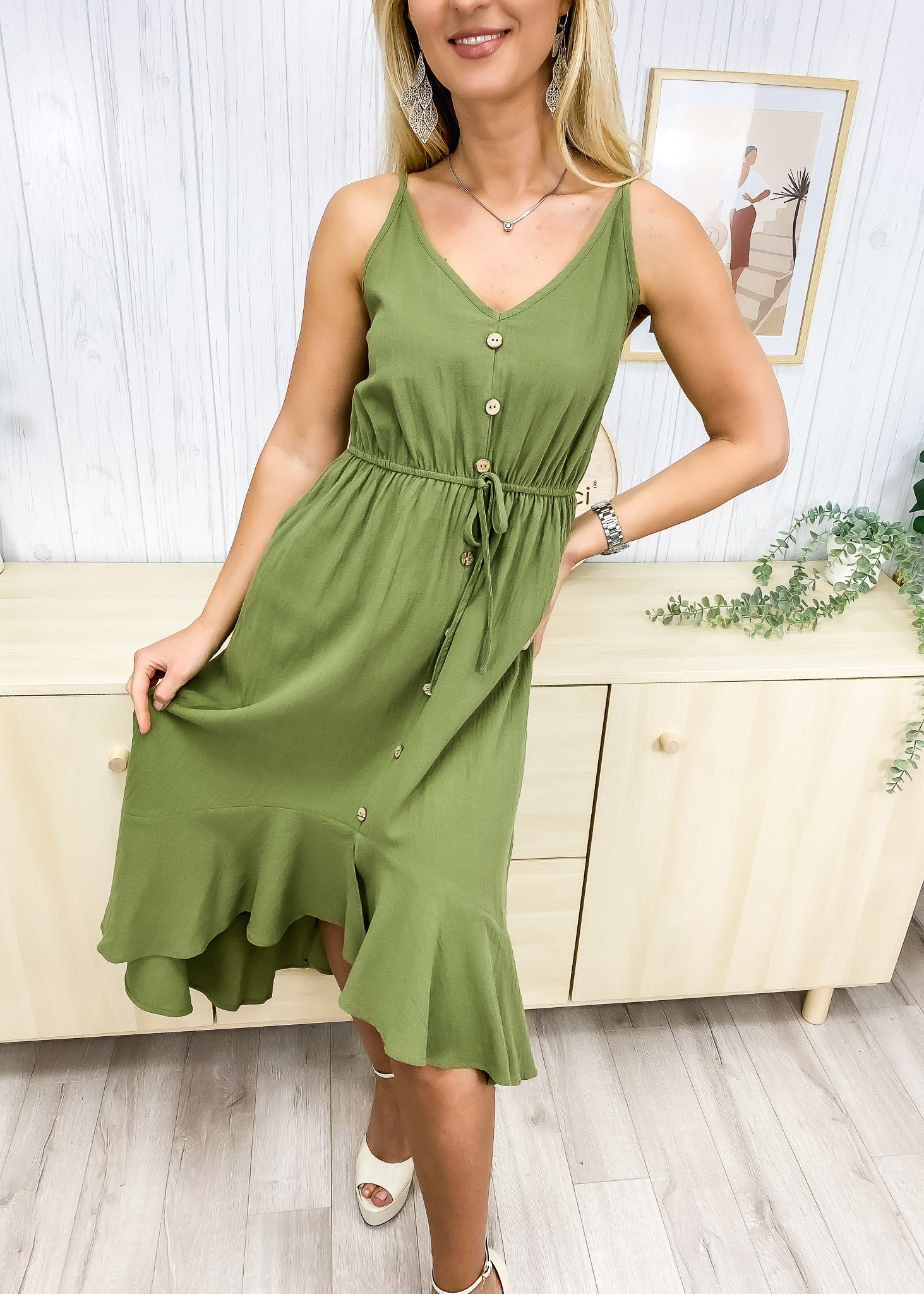 The EMES SHOP dress is detailed with a unique asymmetrical hem. Features a v neck line. tie waist detail. button front design. spaghetti straps. flowy skirt. and above knee length. Pair it with sunnies and sneakers for a laidback look.