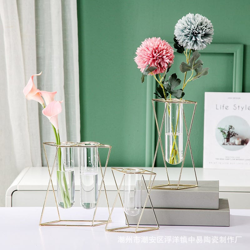 The EMES SHOP vase details a unique design of a glass test tube nestled in the center of a gold colored iron stand. Place this home décor anywhere inside your house to bring a dash of creativity and liveliness.