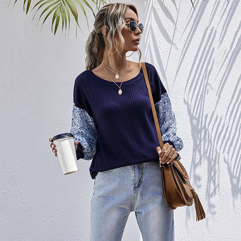 The EMES SHOP sweater is detailed with a gorgeous two tone floral print design on the sleeves. Features a round neck line. long sleeves. waffle knit material. and relaxed fit. Pair it with a denim skirt and slip-on shoes for an easy day look.