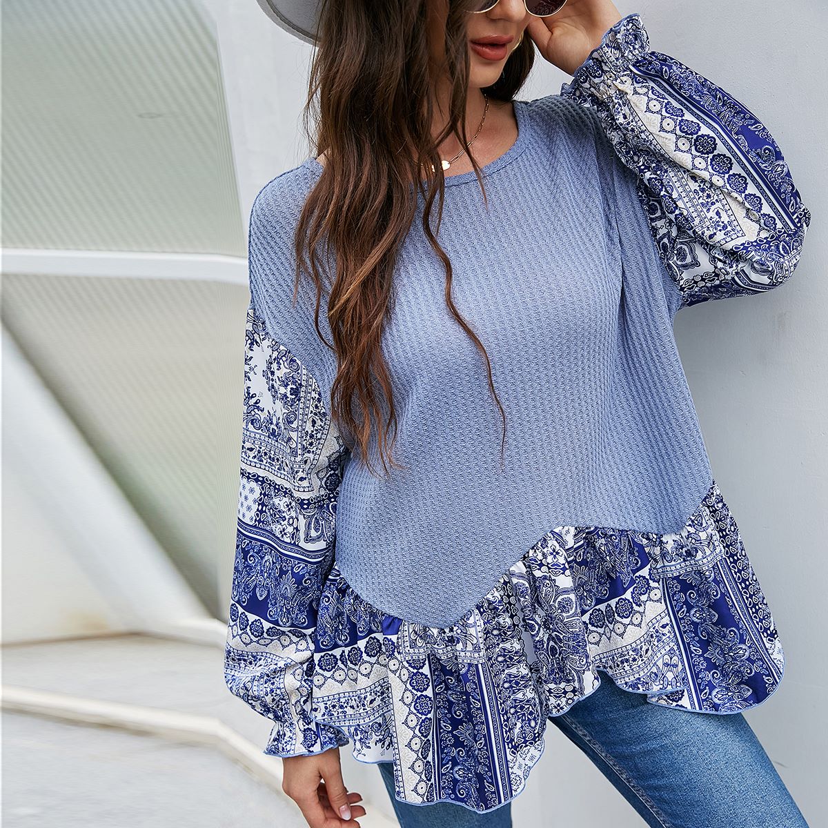 The EMES SHOP sweater is detailed with a fun two tone design featuring gorgeous paisley prints. Features a round neck line. long bishop sleeves. drop shoulder. asymmetrical hem. waffle knit texture. and an oversized fit. Pair it with denim skinny jeans and sneakers for an easygoing look.