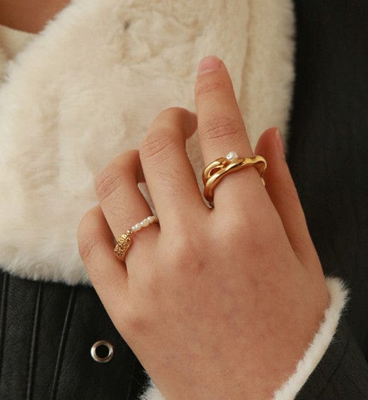 The EMES SHOP ring details an uneven double layered design with a small pearl bead at the tip. Features a gold tone setting and a textured surface.