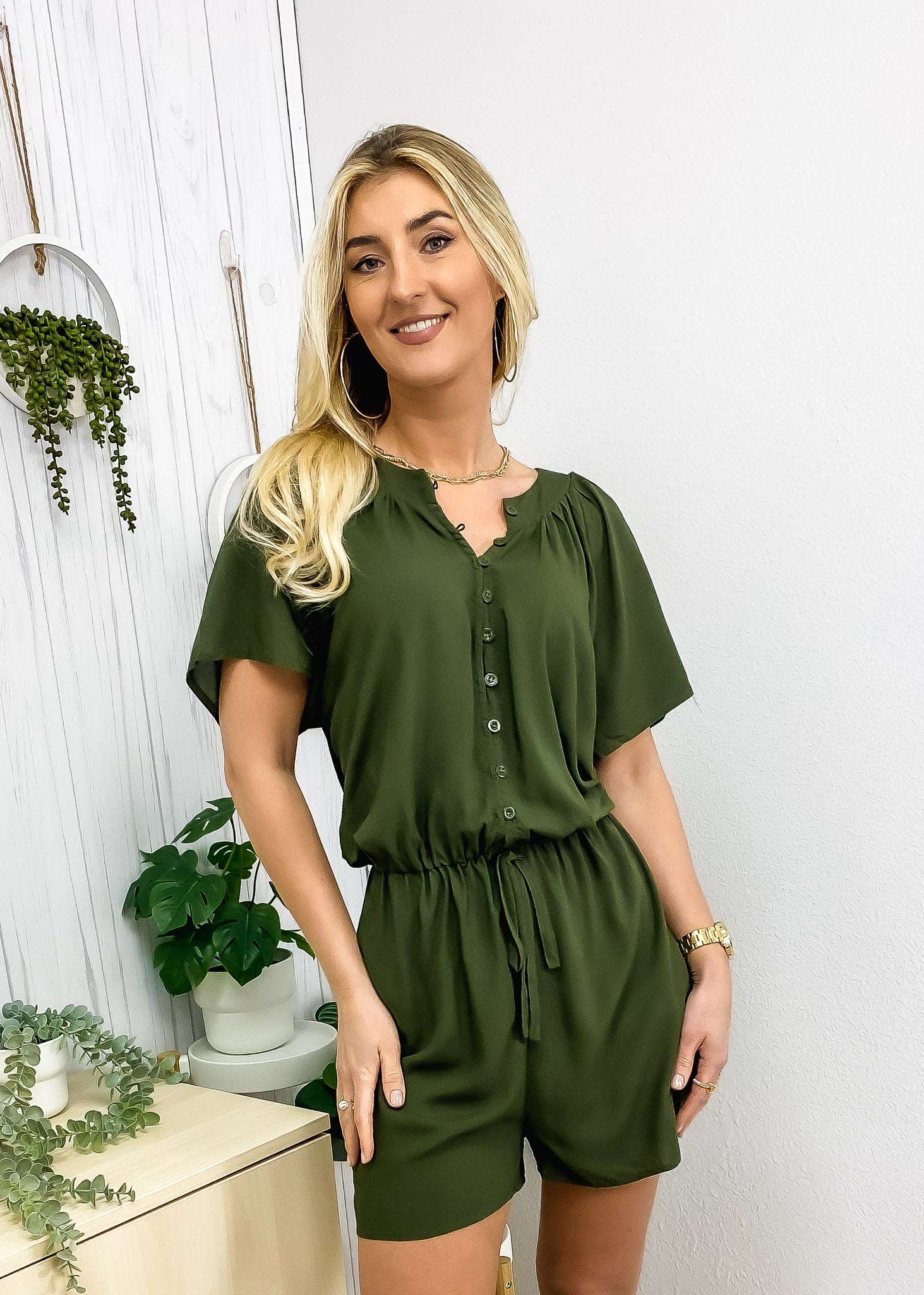 The EMES SHOP romper is detailed with a classic v neck line. Features solid color. button front design. short sleeves. drawstring waist. and loose fit. Pair it with a fedora hat and boots for a chic look.
